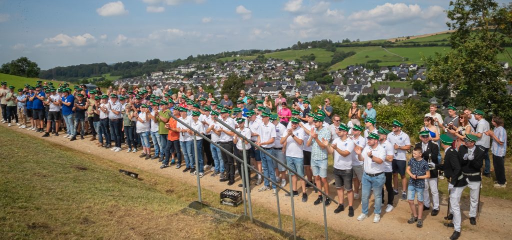 Die ehemaligen Majestäten des Schützenvereins Elspe sind an den blau-weißen Kordeln, die sie an ihren Mützen tragen zu erkennen. Während des sonntäglichen Festzugs bildet die Königskompanie einen eigenen Zug.